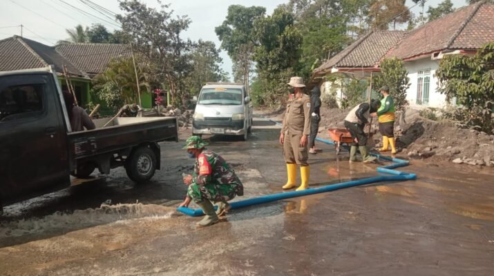 Lumajang – Upaya pemulihan pasca erupsi Gunung Semeru terus digencarkan. Personel gabungan Kodim 0821/Lumajang dan Yonif 527/BY turun langsung membantu warga membersihkan material vulkanik