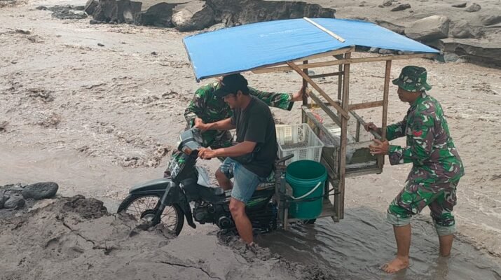 Lumajang – Kepedulian TNI terhadap keselamatan masyarakat kembali terlihat di wilayah terdampak erupsi Gunung Semeru. Bati Tuud Koramil 0821-15/Tekung, Pelda Rudi Rusmianto, bersama empat