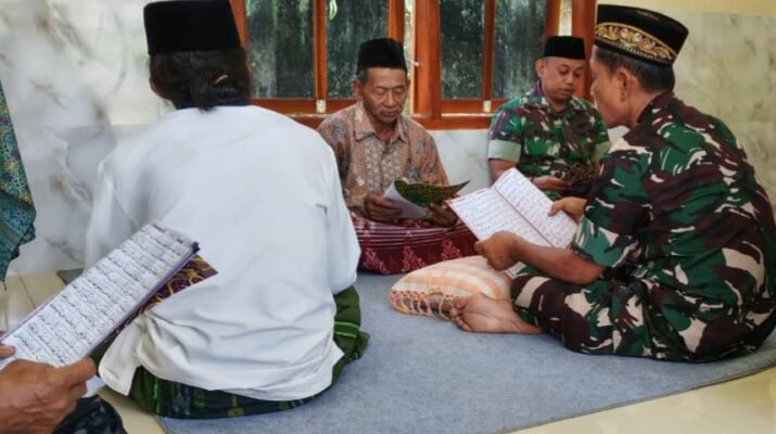 LEBAKHARJO – Sebanyak 7 orang menghatam Al Quran dalam rangka memasuki rumah baru. Tradisi ini di pimpin Pabintal Korem 083/Baladhika Jaya, Letda Inf Januri didampingi Sertu Edi dengan Tokoh Masyarakat Ahmad Jari, di kediaman Munaji warga Dusun Krajan 1 B Lebakharjo, Ampelgading, Kabupaten Malang, Jawa Timur, Kamis (16/10/2025). Suasana rumah dipenuhi lantunan ayat suci disaat waktu mengaji atau membaca Al Quran 30 Juzz dimulai pukul 09.20 wib dan selesai pukul 11.30 wib.
